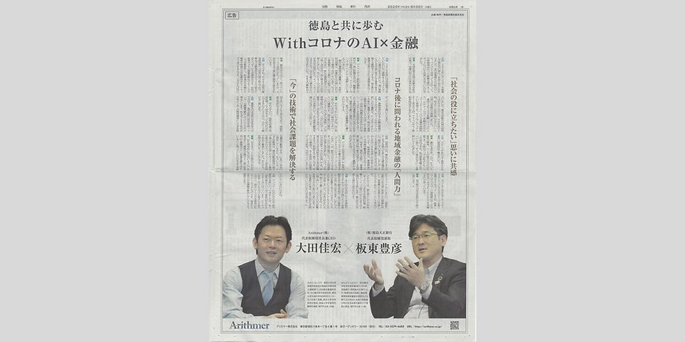 徳島新聞の6面(2020年9月30日付)に徳島大正銀行の板東代表取締役頭取と弊社代表の対談が掲載されました。徳島大正銀行様は金融とテクノロジーを融合させた「フィンテック」において必要とされるAI技術を早い段階から取り入れています。本記事では弊社と協業開発をさせていただいている「業務AIチャットボット」や「統合データベース」について詳しく記載しています。デジタル技術を活用して、これまでのビジネスモデルや働き方を変革する「デジタルトランスフォメーション(DX)」が新型コロナウィルスをきっかけにますます重要視される中、地方銀行として最新鋭の取り組みを続ける徳島大正銀行様の技術革新についてご紹介しています。